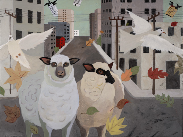Edgar and Ruby's Day in the City, with Leaf Blower, 2004, acrylic on canvas, 30" x 40" |